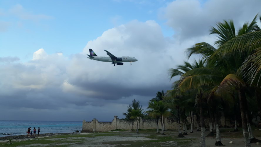 Es ist sehr faszinierend, die anreisenden Flugzeuge auf Cozumel zu beobachten. Denn der Flughafen liegt direkt am Meer. Vom angrenzenden Kalkstein-Strand sieht man den ankommenden Flugzeugen beim Landen zu.